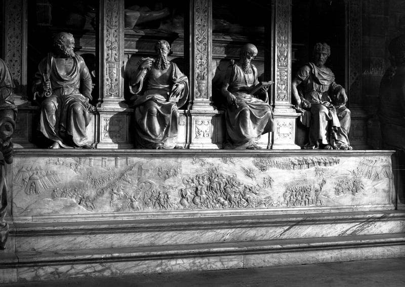 Tombeau de Louis XII et d'Anne de Bretagne : arcades de l'édicule avec quatre apôtres et bas-relief du soubassement