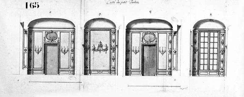 Dessin : cabinet carré, décoration intérieure du côté du petit jardin