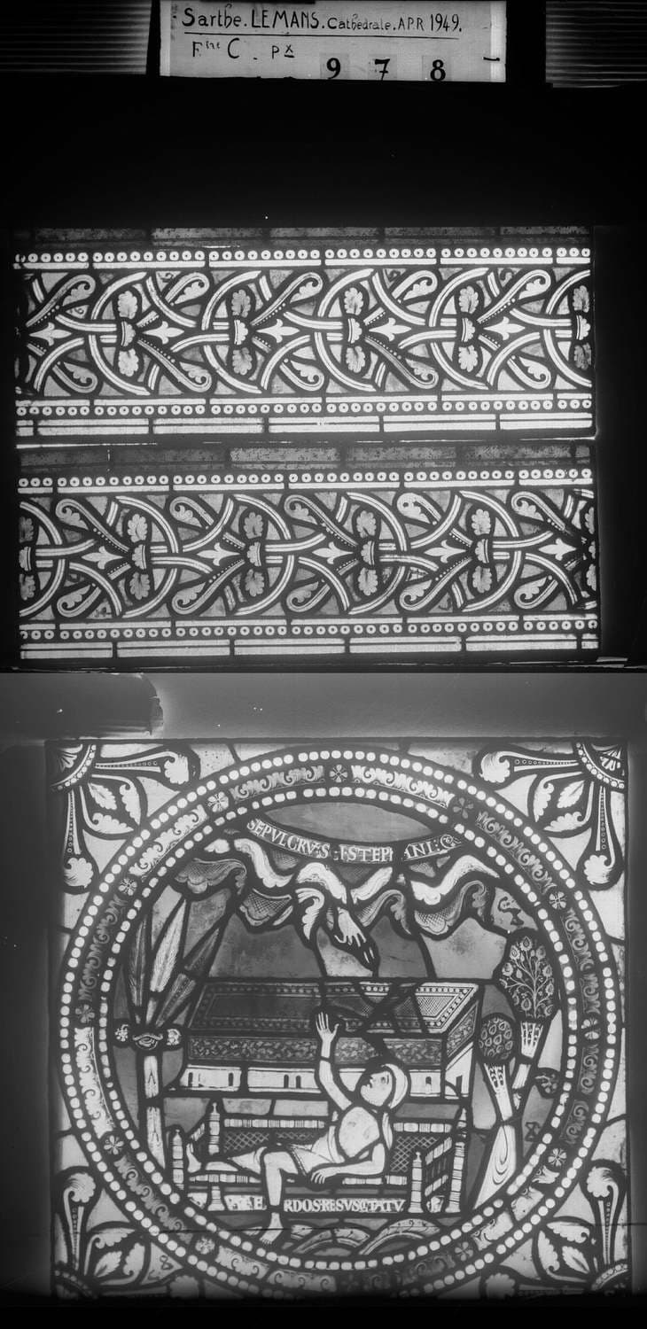 Mages et saint Etienne, baie C, panneau de vitrail 1 3 et baie D, panneau de vitrail 14 et baie T, panneau de vitrail 1