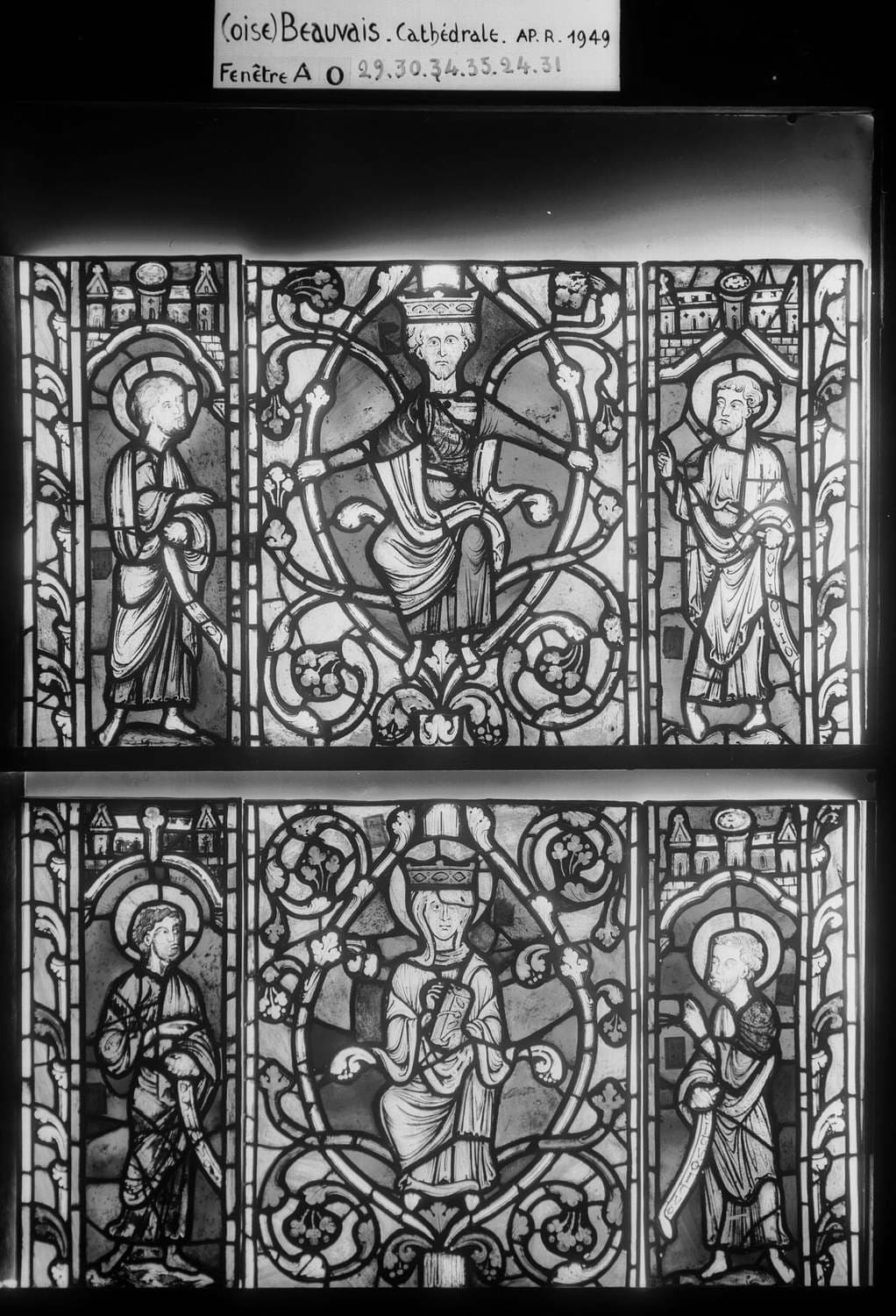Arbre de Jessé et enfance de Jésus, chapelle de la Vierge, baie A 0, panneau de vitrail 24 30 31 29 34 35