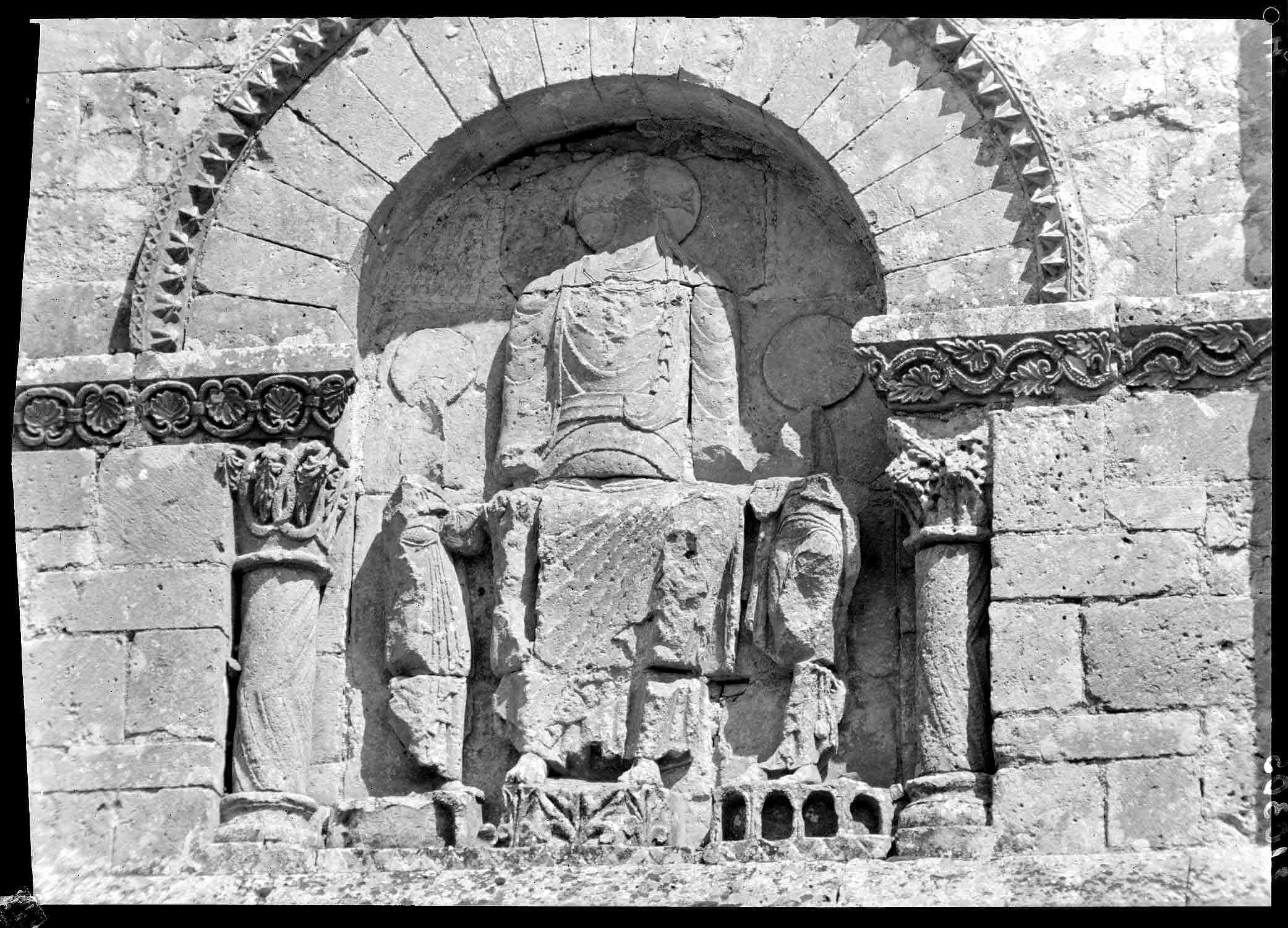 POP | Plateforme ouverte du patrimoineNiche latéral sud au-dessus du portail : le Christ assis entre Vierge et saint Jean