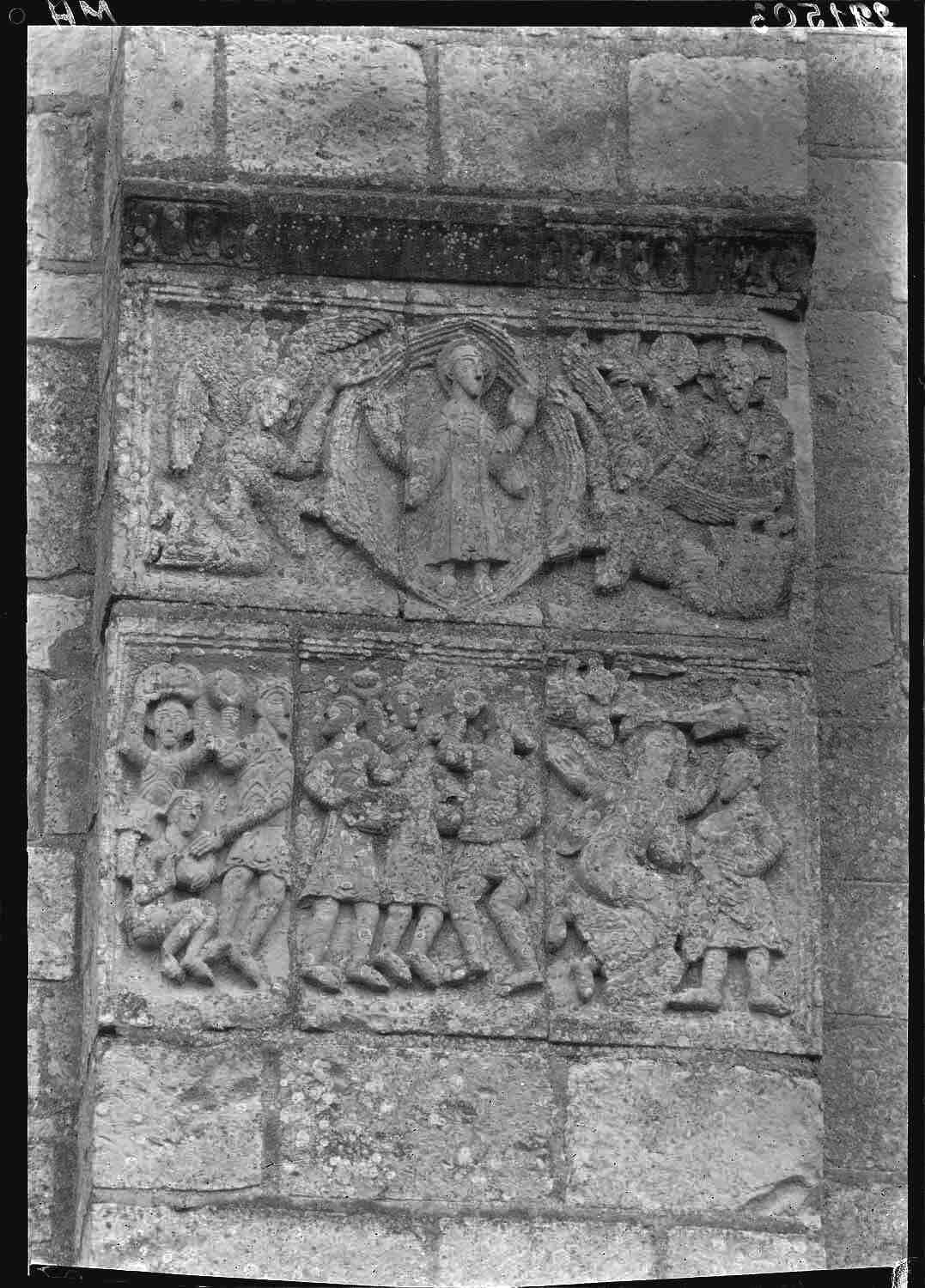 Clocher-porche : reliefs encastrés dans le contrefort entre les travées 2 et 3, ensemble