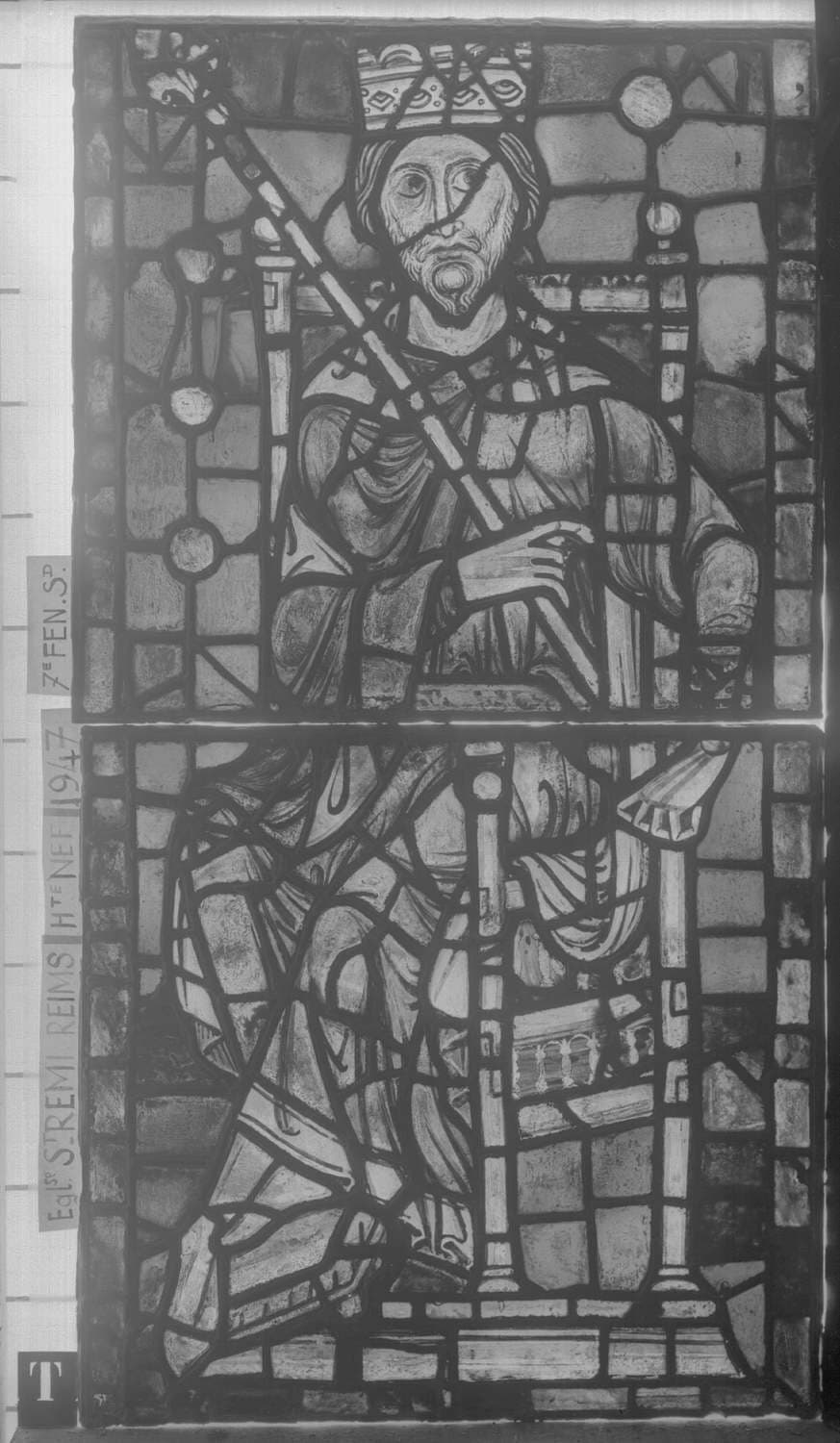 Personnage assis, baie T, panneau de vitrail