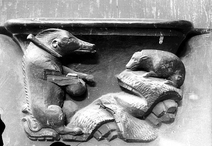 POP | Plateforme ouverte du patrimoineCôté de l'Évangile, miséricorde sculptée d'une stalle du bas : une truie qui file ou joue de la cornemuse ou amusant son petit