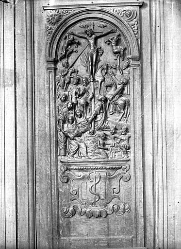 POP | Plateforme ouverte du patrimoineBoiseries de la sacristie, provenant d'anciennes stalles : La Crucifixion