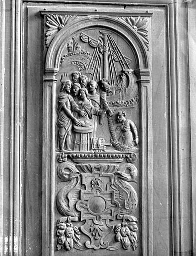 POP | Plateforme ouverte du patrimoineBoiseries de la sacristie, provenant d'anciennes stalles : Le Repas du Christ au bord du lac