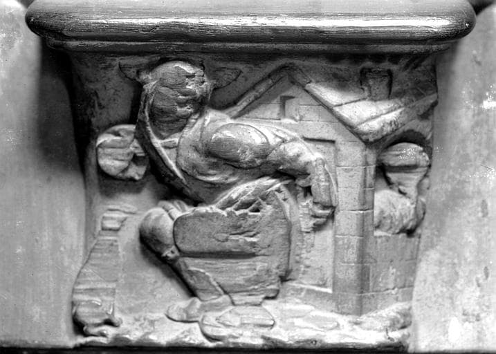 POP | Plateforme ouverte du patrimoineSérie inférieure de la miséricorde côté nord: personnage souillant le seuil d'une maison, un autre exprime sa sensation