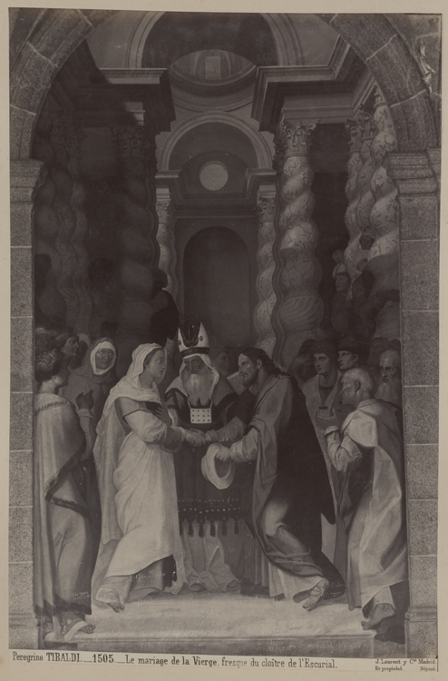 [Sur le tirage, en bas] Peregrino TIBALDI. 1505. Le mariage de la Vierge, fresque du cloître de l’Escurial. J. Laurent y Cia. Madrid. Es propriedad. Déposé.