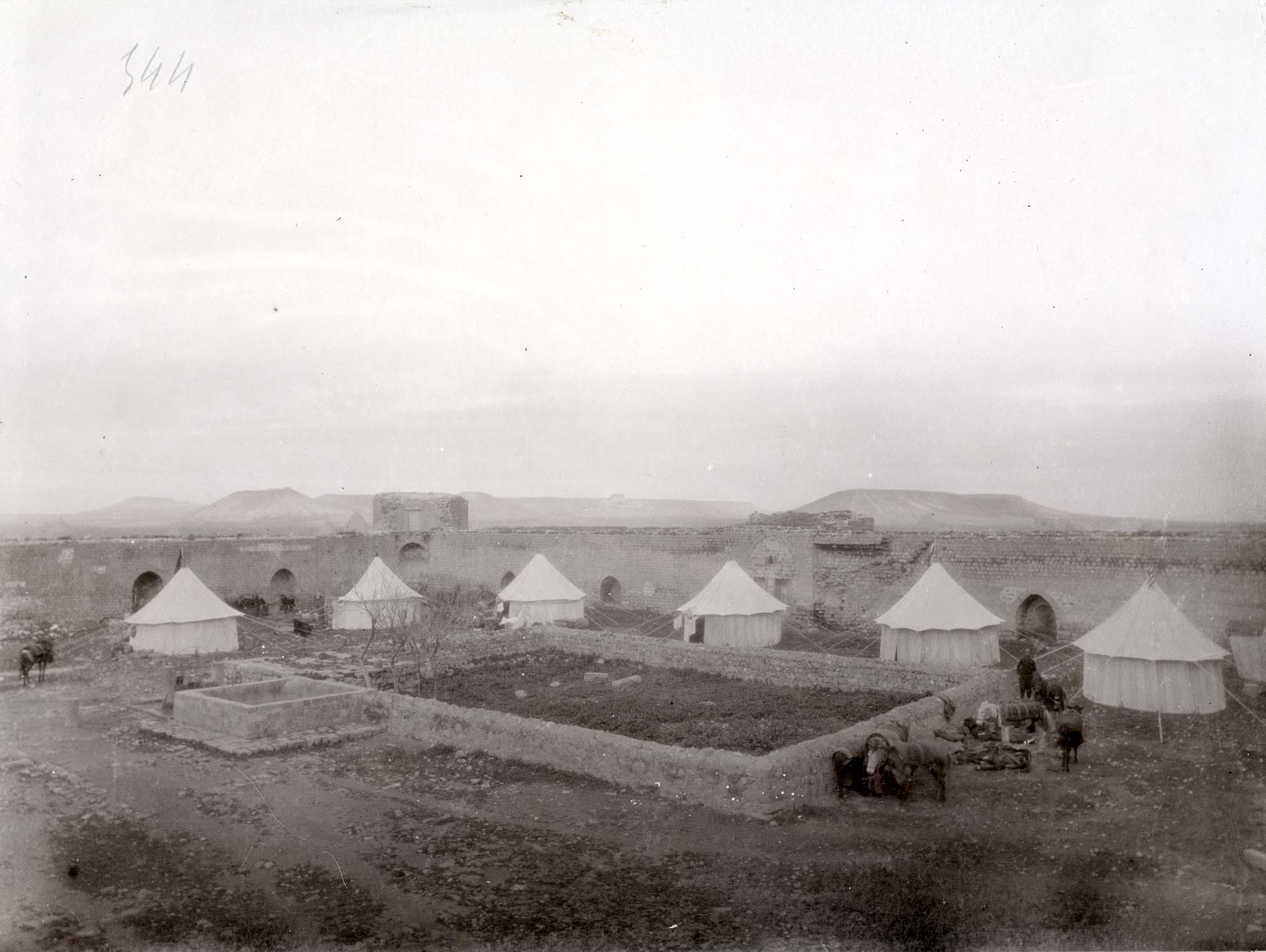 POP | Plateforme ouverte du patrimoineVue générale de la cour et du campement de l'expédition archéologique, prise du sud-est