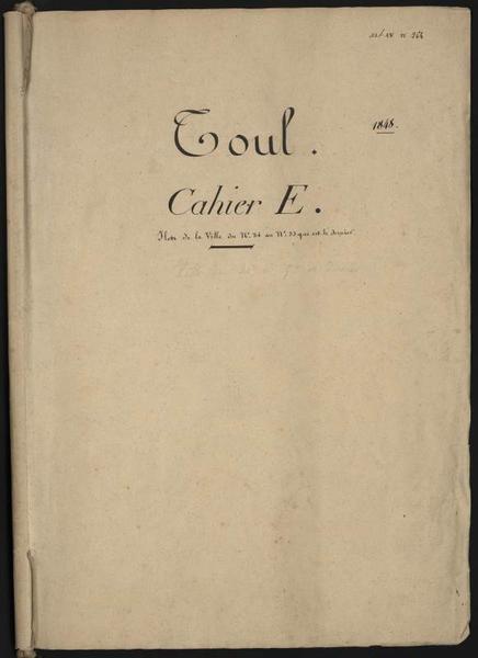Art. IV n°264 ; Toul. Cahier E. Ilots de la Ville du n°34 au n°53 qui est le dernier. 1e page de couverture recto.