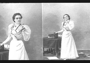 ACTRICE ; MI CORPS ; EN PIED ; COSTUME DE VILLE ; BIJOU ; FLEUR ; TABLE ; LIVRE ; VUE DE FACE ; VUE DE TROIS QUART