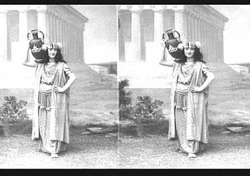 ACTRICE ; EN PIED ; COSTUME DE SCENE ; STYLE ORIENTALISANT ; CRUCHE ; TEMPLE ; VUE DE FACE ; SOURIRE ; COMEDIE
