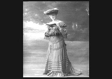 ACTRICE ; EN PIED ; COSTUME DE VILLE ; CHAPEAU ; LIVRE ; VUE DE TROIS QUARTS ; TOILE DE FOND