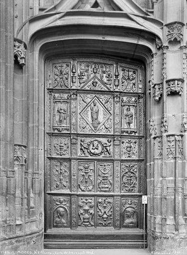 Portail du transept nord : vantail en boiseries sculptées de la porte gauche