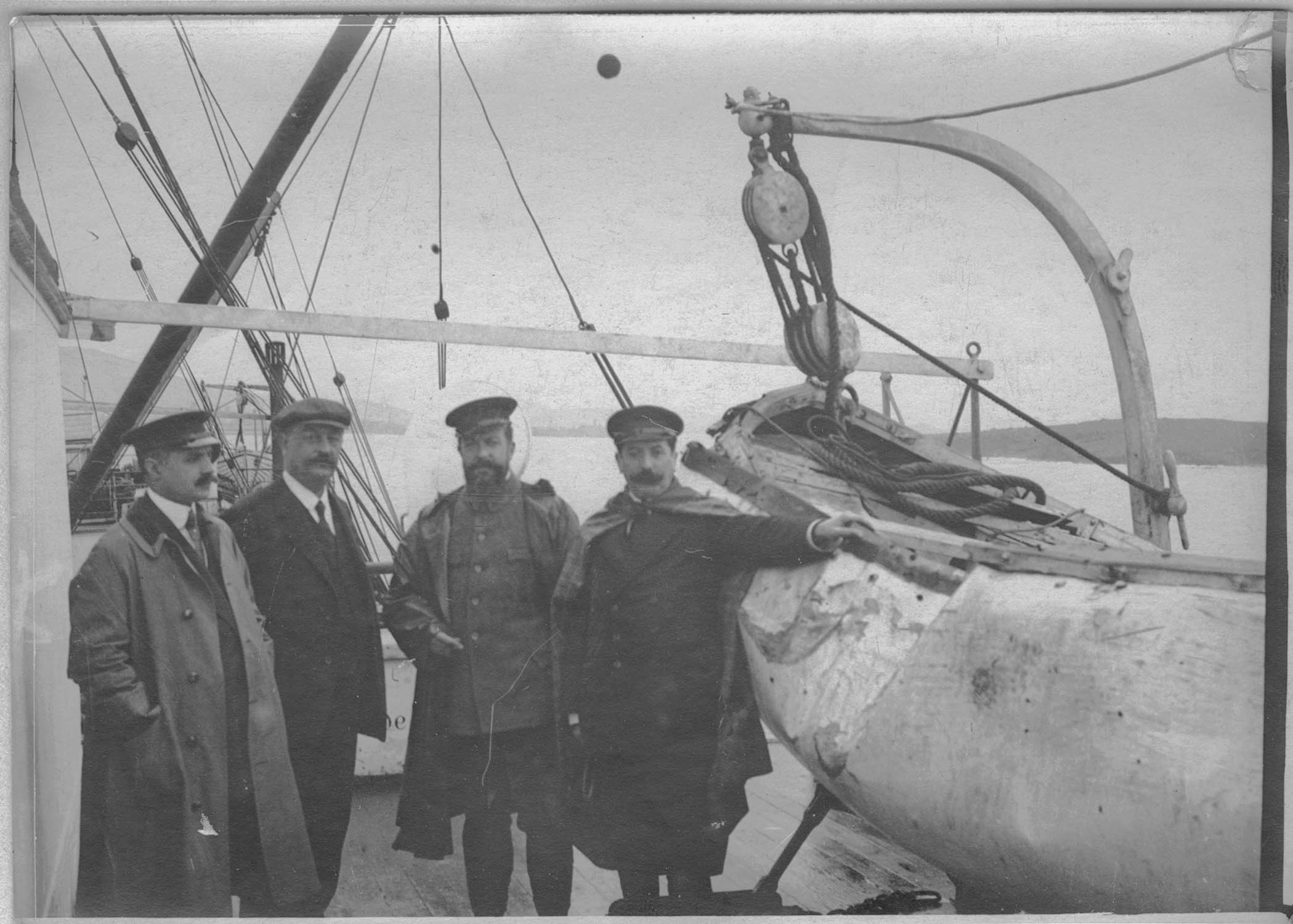 Salonique. A bord de la Ville-de-Bordeaux. La commission parlementaire de la Marine. MM. Boussenot, Ganault, Vigne et Garat, dans le navire qui les transporte à Moudros