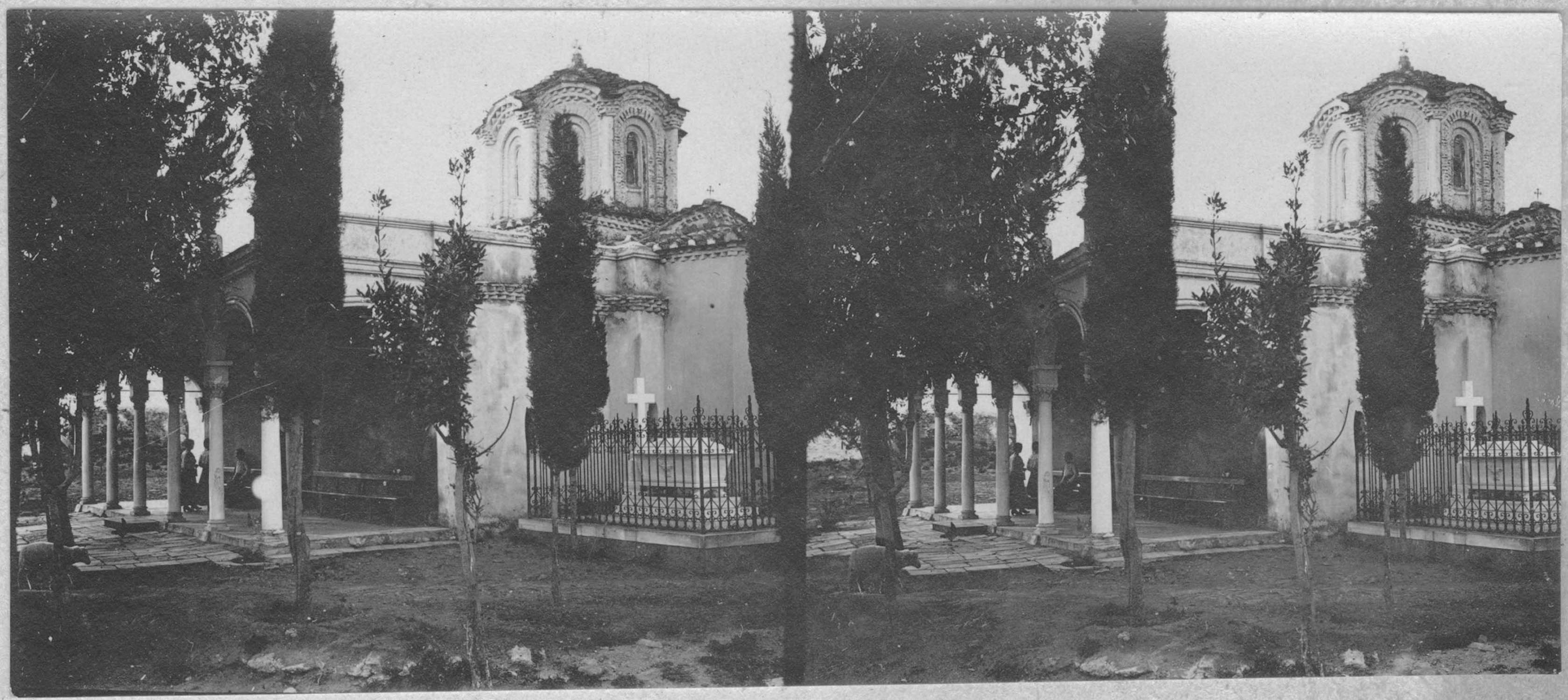 Salonique. L'église Vlatéon, au pied des remparts. Monastère. Le monument du fondateur