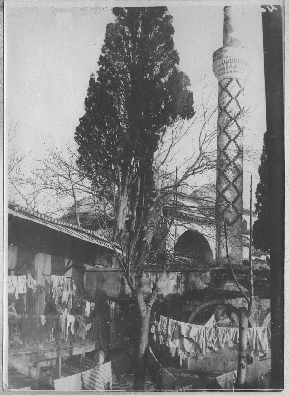 POP | Plateforme ouverte du patrimoineSalonique. La mosquée Djeimaret Aladja prise d'une cour habitée par des Tziganes ; [Mosquée Aladja-Imaret. Linge de réfugiés ?]
