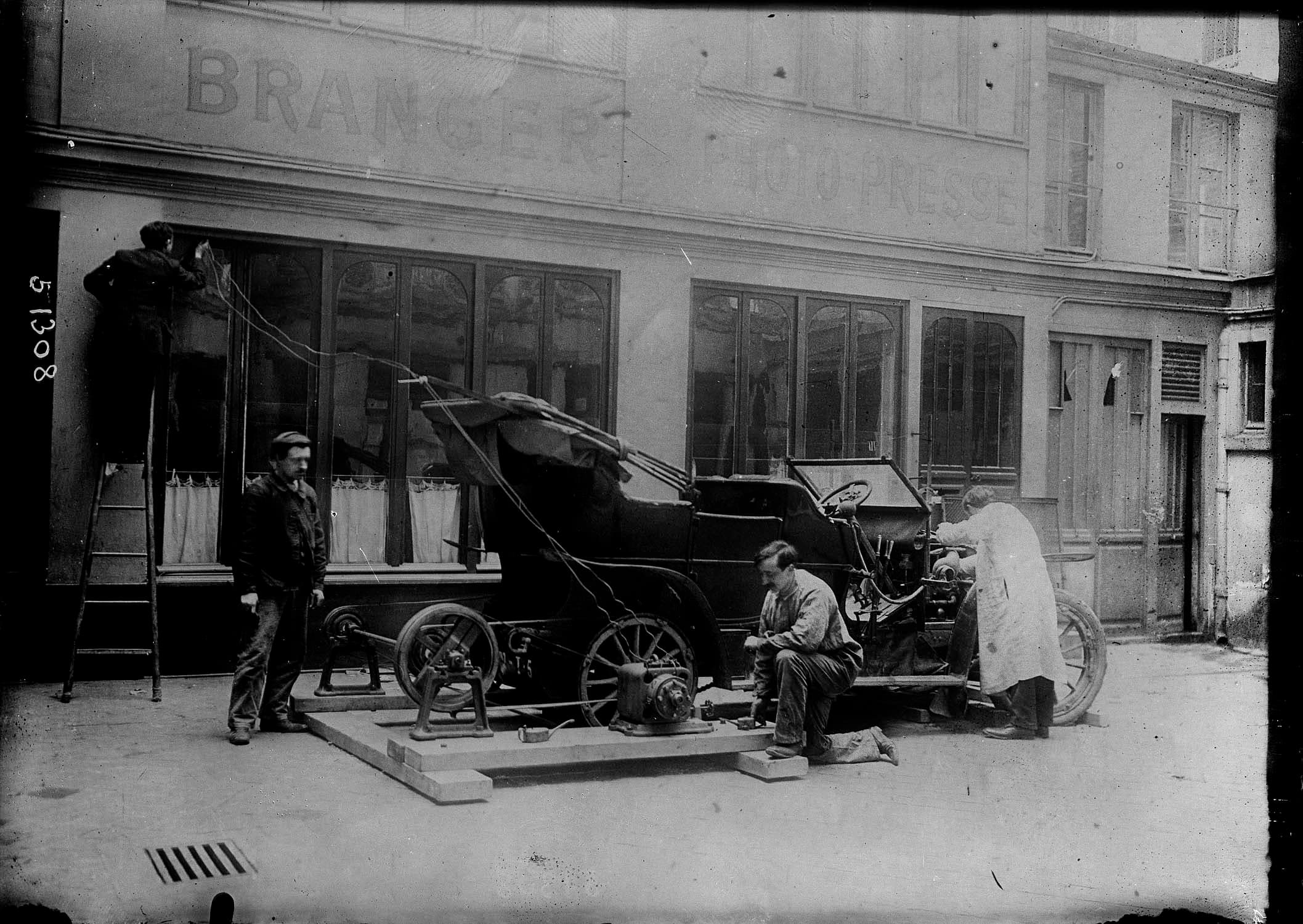 Devant le magasin du photographe, trois hommes transformant une automobile en générateur électrique