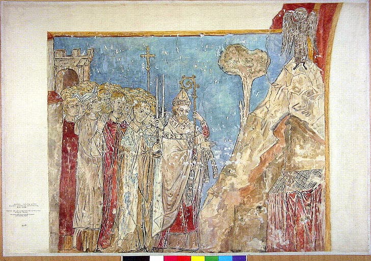 Scène de la légende de saint Michel, l'apparition de saint Michel au pape Gélase et aux clercs qui l'accompagnent