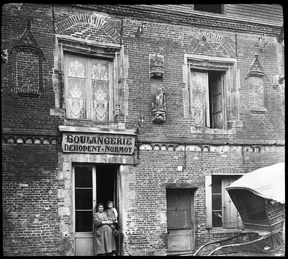 POP | Plateforme ouverte du patrimoineFemme portant un enfant sur le seuil, enseigne de boulangerie