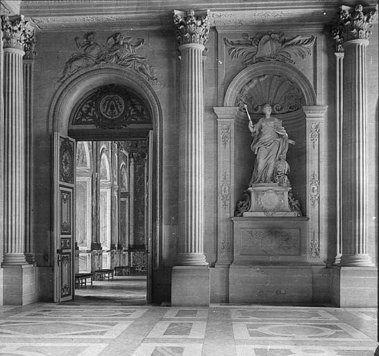 Intérieur, vestibule du premier étage, une statue et la porte d'accès à un salon