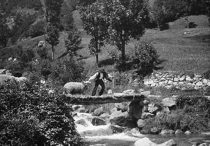 POP | Plateforme ouverte du patrimoinePlateau de Cambasque, troupeau de moutons passant le torrent sur une passerelle