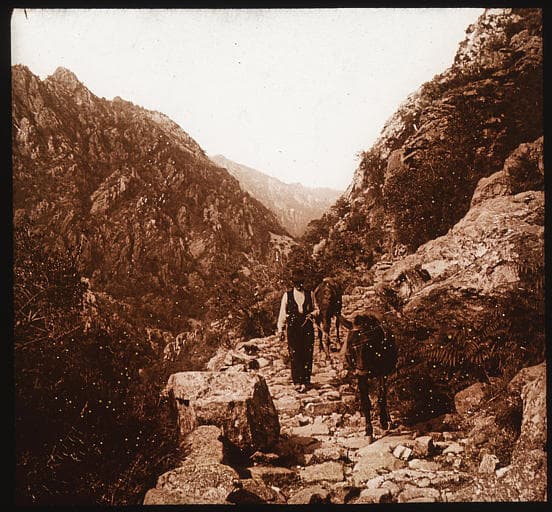 POP | Plateforme ouverte du patrimoineHomme menant deux ânes sur le sentier pierreux longeant la Spelunca