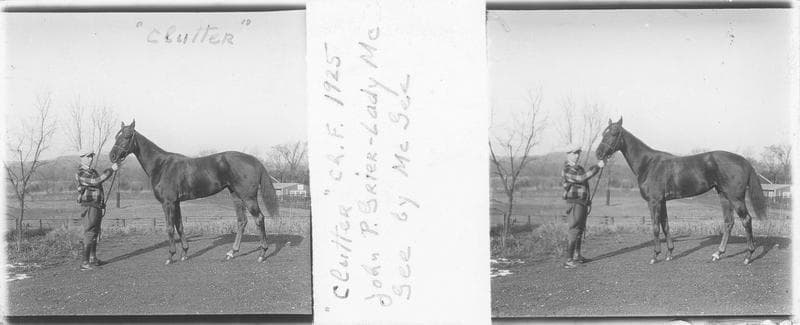 Clutter (1925), cheval de course vu de profil et homme sur un chemin. Pedigree : John P. Grier (1917) et Lady McGee (1909)