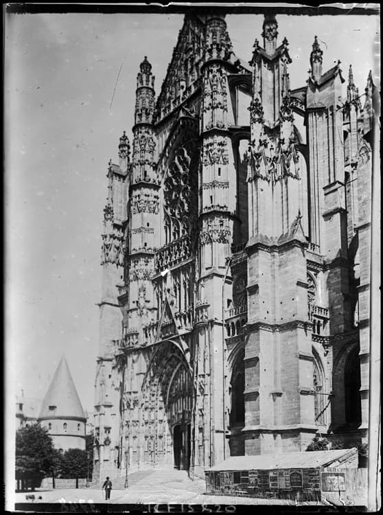 Vue latérale de la façade Sud, un homme posant au pied de l’escalier, une tour de l’ancien palais épiscopale à l’arrière