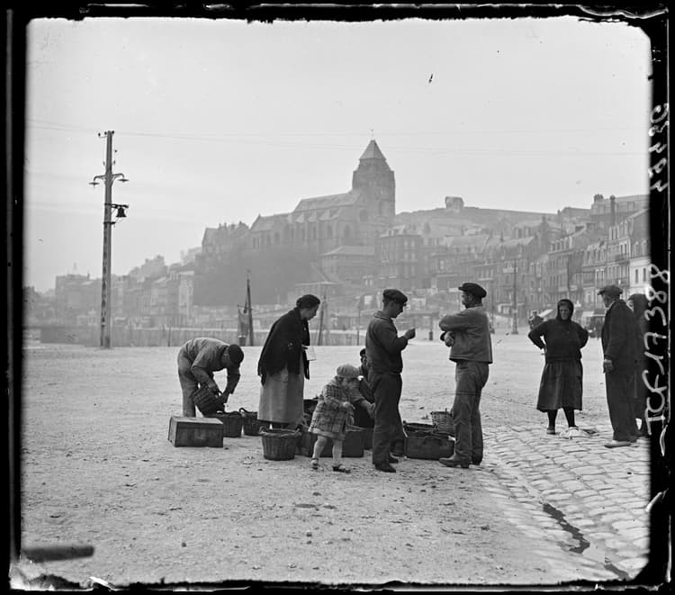 POP | Plateforme ouverte du patrimoineFamille de pêcheurs sur les quais, entourée de paniers et de passants, l’église Saint-Jacques en arrière-plan