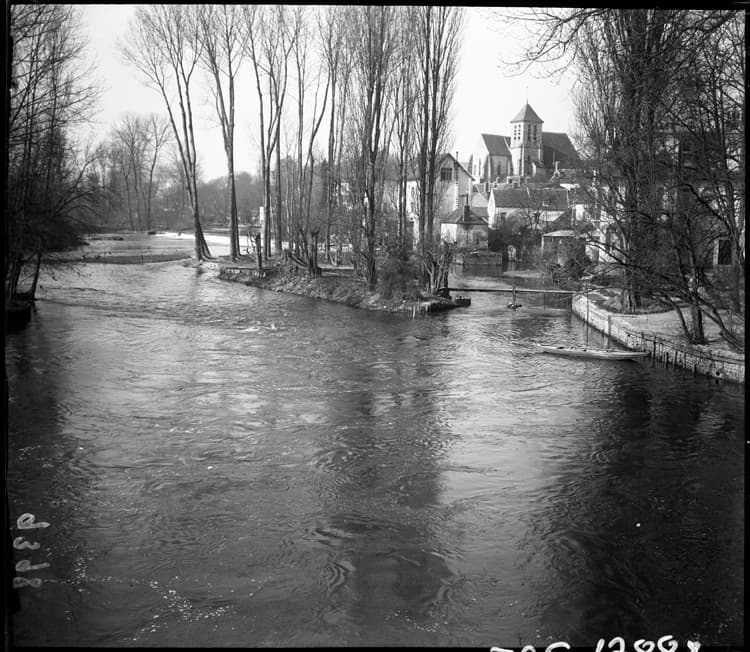 POP | Plateforme ouverte du patrimoineL’inondation de 1910 [sur les berges du Loing, l’église Saint-Pierre-et-Saint-Paul en arrière-plan]
