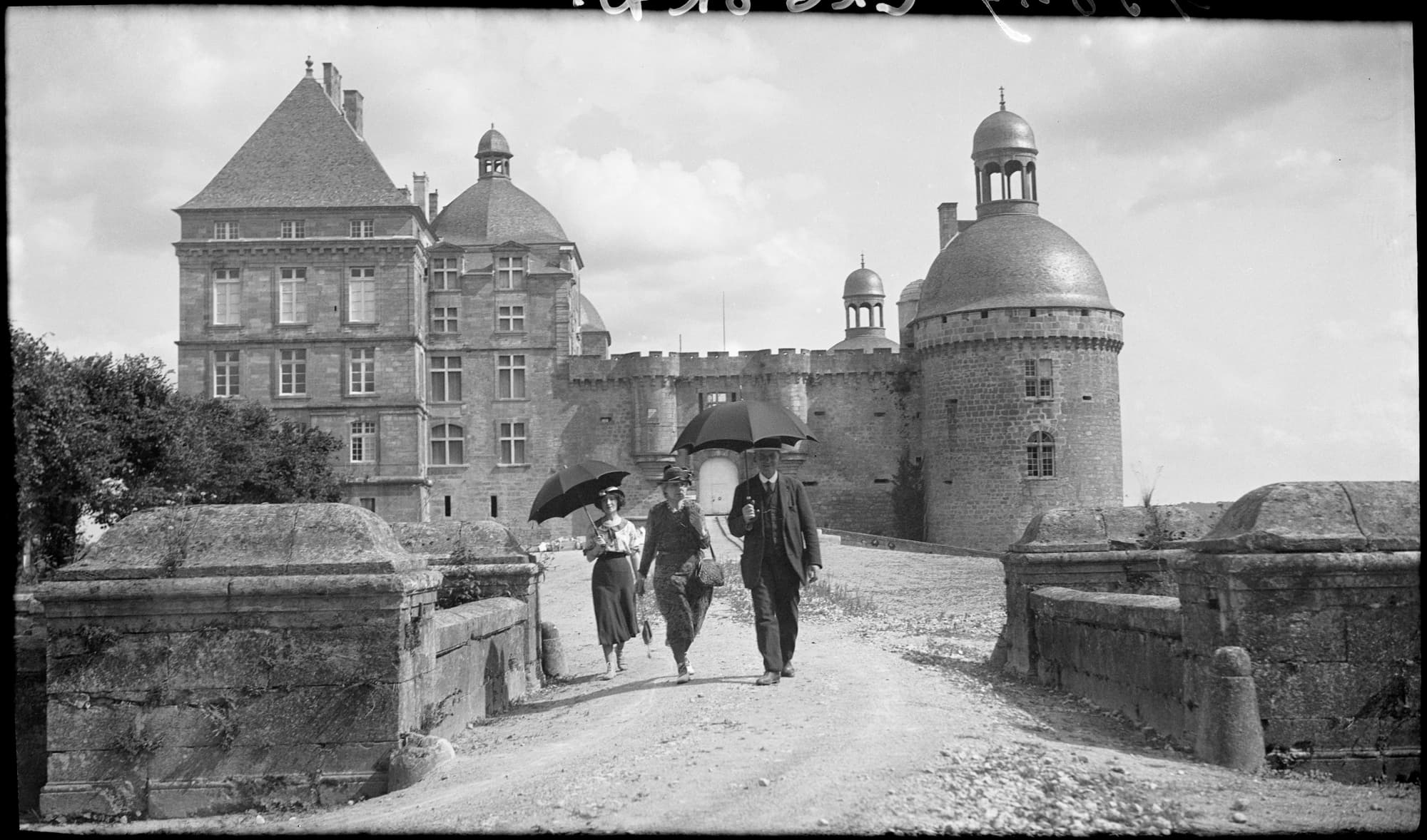 Façade ouest : trois visiteurs à l’entrée du château
