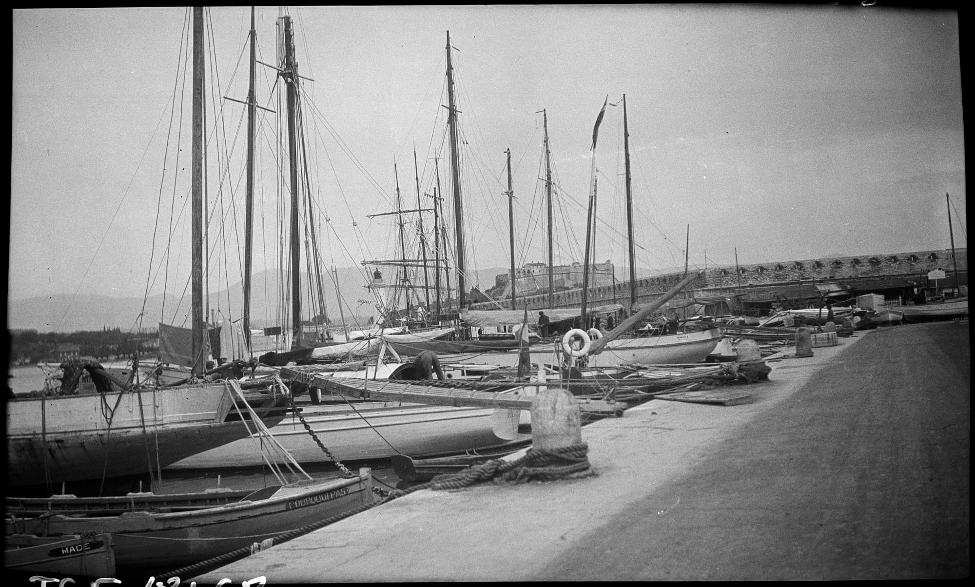 Bateaux amarrés à un quai, le fort en arrière-plan