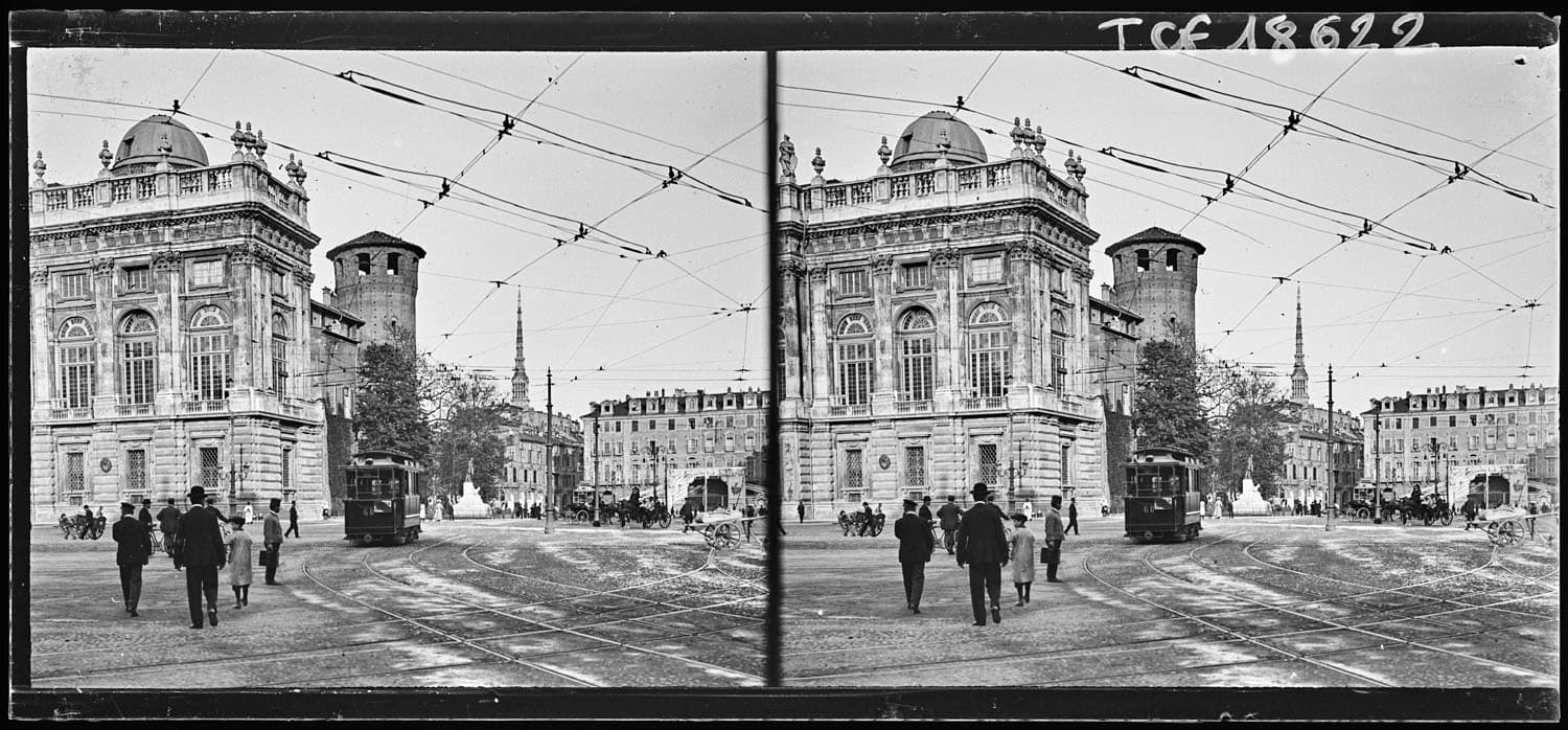 POP | Plateforme ouverte du patrimoinePromeneurs et tramway passant devant la façade baroque, tour médiévale à l'arrière