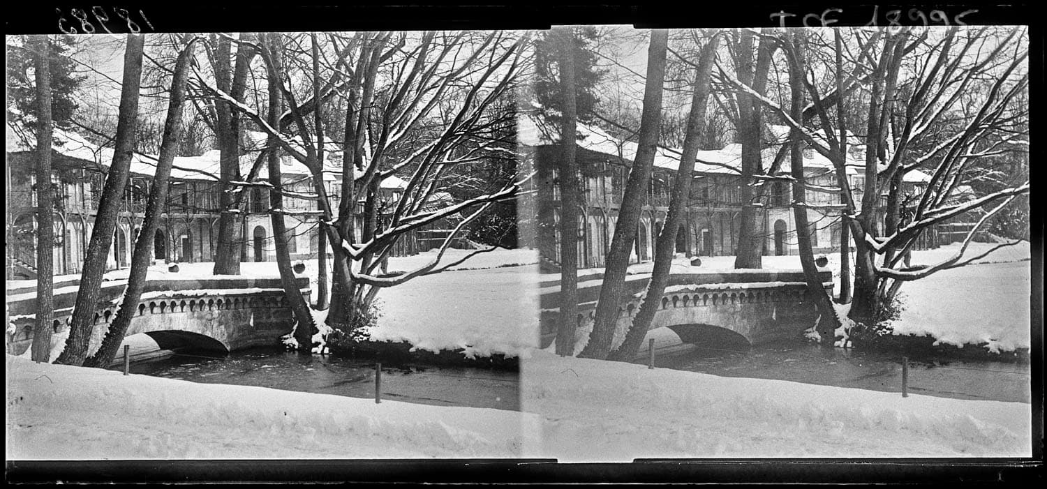 POP | Plateforme ouverte du patrimoineTrianon : façade sur le parc enneigé vue à travers les arbres