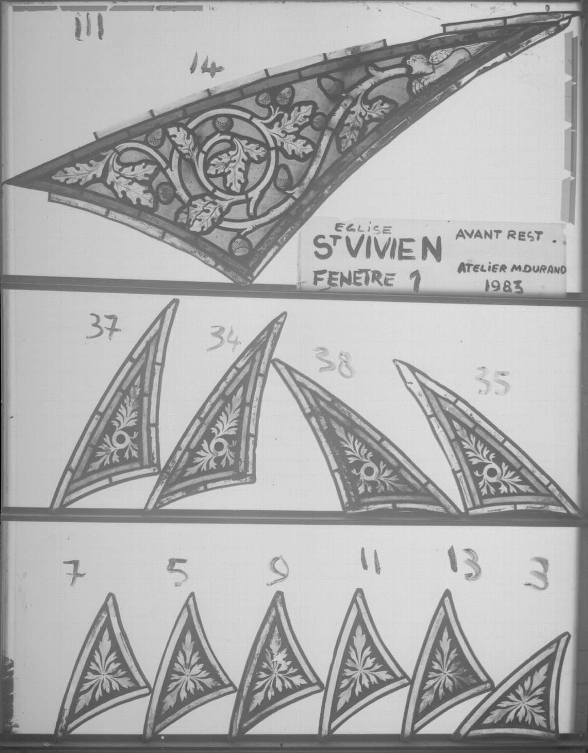 Fenêtre 1 ; Façade Ouest ; Fragments 5 - 7 - 9 - 11 - 13 - 3 - 35 - 35 - 37 - 38 - 14