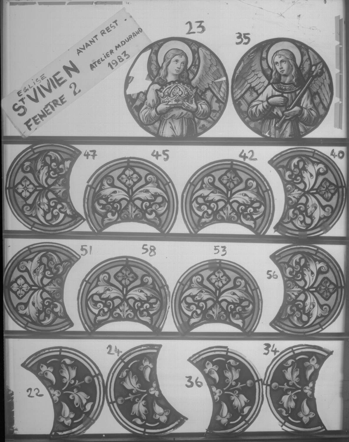 Fenêtre 2 ; Façade Ouest ; Fragments 24 - 22 - 23 - 25 - 47 - 45 - 42 - 40 - 51 - 58 - 53 - 56
