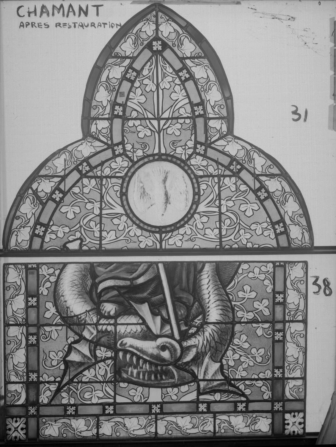 Fenêtre A ; Panneaux 31 (Saint Esprit) – 38 (Démon terrassé)