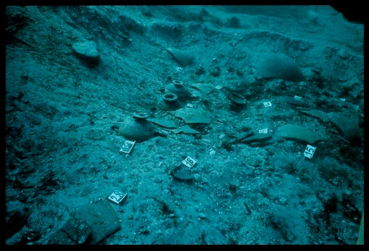 Vue sous-marine des fragments de céramique in situ (fouille L. Long/Drassm).