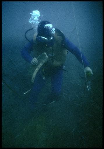 Vue sous-marine d'un plongeur remontant un fragment de rebord de céramique (fouille L. Long).
