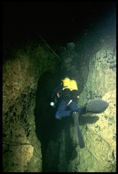 Vue sous-marine d'un plongeur dans la galerie (fouille CNRAS).