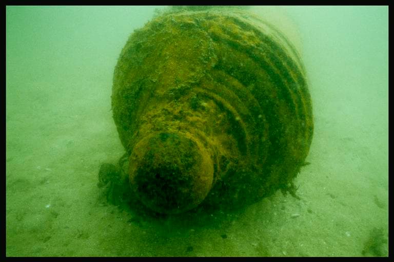 Vue sous-marine d'un canon in situ (fouille M. L'Hour/Drassm).