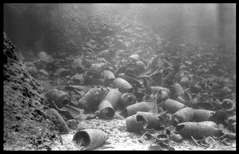 Vue sous-marine des amphores in situ (fouille A. Tchernia).