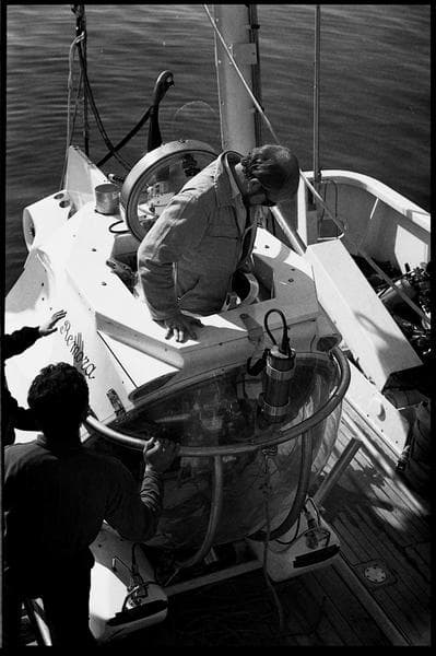 Vue de l'embarquement l'un des membres de l'équipe (Michel L'Hour) à bord du sous-marin Rémora (fouille M. L'Hour/Drassm).