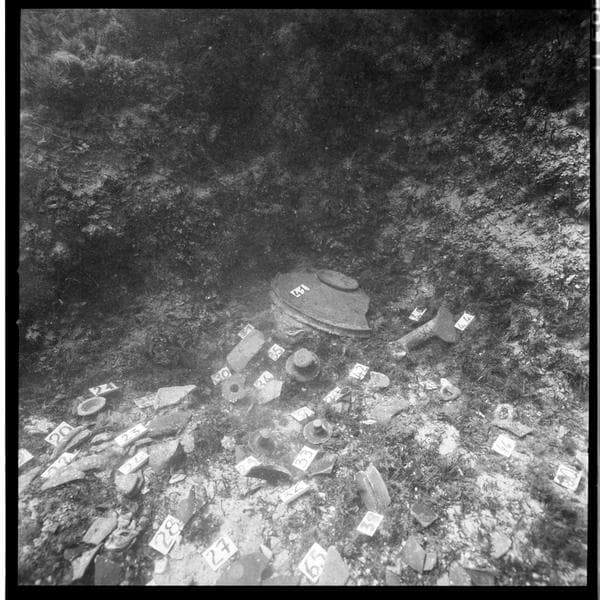 Vue sous-marine de fragments de céramique attique in situ (fouille L. Long/Drassm).