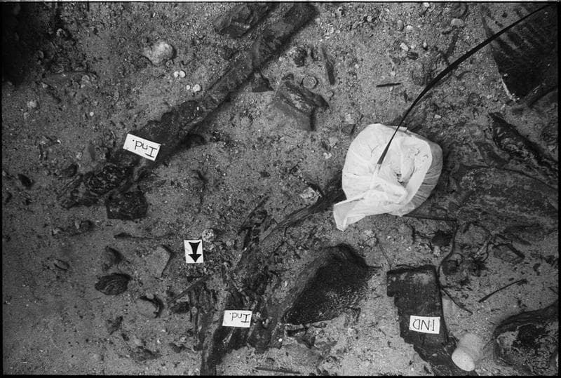 Vue sous-marine de trois fragments de vaigrage (fouille M. Sciallano).