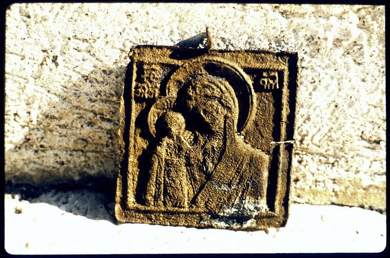 Vue d'une icône de vierge à l'enfant en laiton (fouille M. Guérout).