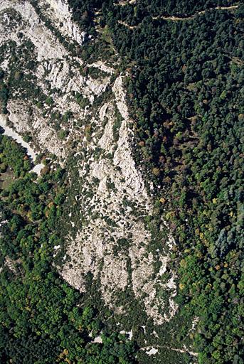 Vue générale du castrum d'Esclapon prise de l'est. On aperçoit des bâtiments ruinés et des pans de murs au milieu des rochers. Vue générale du castrum d'Esclapon prise de l'est (La Roque-Esclapon, Var).
