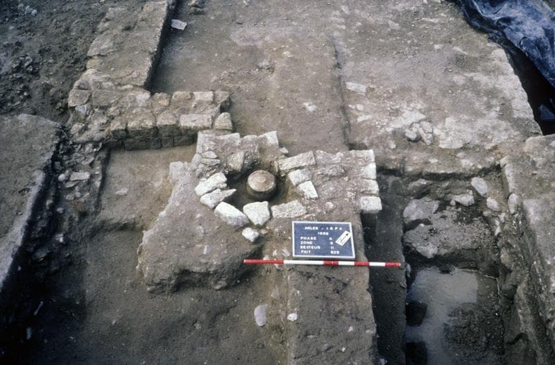 Vue rapprochée d'une structure funéraire (zone 3, us 869) comportant un empierrement de blocs encadrant une urne et son couvercle (MDAA - IRP.89.1138.292-293) datés de la 2e moitié IIe s. apr, n.e. - 1ère moitié IIIe s. apr, n.e. (fouilles de l'IRPA sous la direction de Cl. Sintès, 1989, Arles, Bouches-du-Rhône).