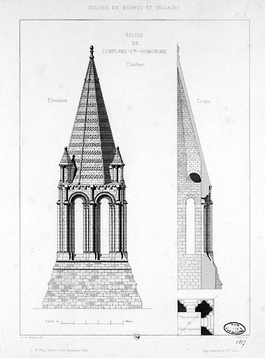 Elévations et coupe du clocher.